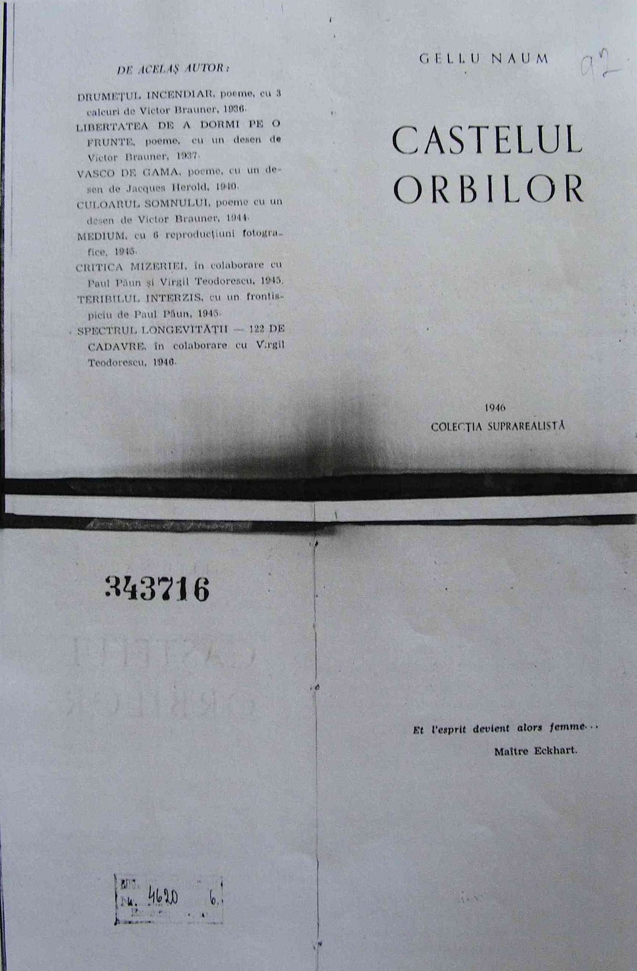 Pe când obsesia mea pentru Gellu Naum atinsese apogeul, adică cu foarte mulţi ani în urmă, întâmplarea a făcut să ajung în posesia unui exemplar din Castelul orbilor, volumul său din 1946.