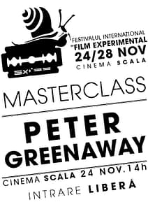 “CINEMA-UL A MURIT, TRAIASCA CINEMA-UL”. Aceasta este tema pe care PETER GREENAWAY o va dezbate la masterclass-ul pe care-l va susţine la Cinema Scala miercuri, 24 noiembrie 2010, orele 14.00. Regizorul va explora profundul impact pe care noile tehnologii digitale îl au asupra limbajului cinematografic şi artelor vizuale. Masterclass-ul se va adresa atât studenţilor de la universităţile de film şi arte vizuale, cât şi publicului larg. Intrarea este liberă, atât la masterclass, cât şi la toate manifestările/proiecţiile EXPIFF, în limita locurilor disponibile.