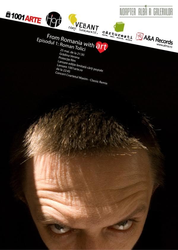 Vom începe la 21.30. După ce fiecare își va găsi locul, pe scaun sau pe băncuțe, în picioare sau pe jos, vom lansa cele ce urmează: primul episod din ”From Romania with Art” dedicat lui Roman Tolici, o ediție limitată de cărți poștale semnate Roman Tolici, un CD cu filme, muzici sau povești și niște eșarfe semnate de designerul Claudia Castrase, de asemenea dedicate lui Roman Tolici. Și site-ul 1001arte.ro (relansat și dedicat în întregime lui Roman Tolici). Apoi, după ce ne vom fi tras puțintel sufletul vom putea urmări liniștiți proiecția filmului cu și despre Roman Tolici. Și așa cu Roman Tolici!